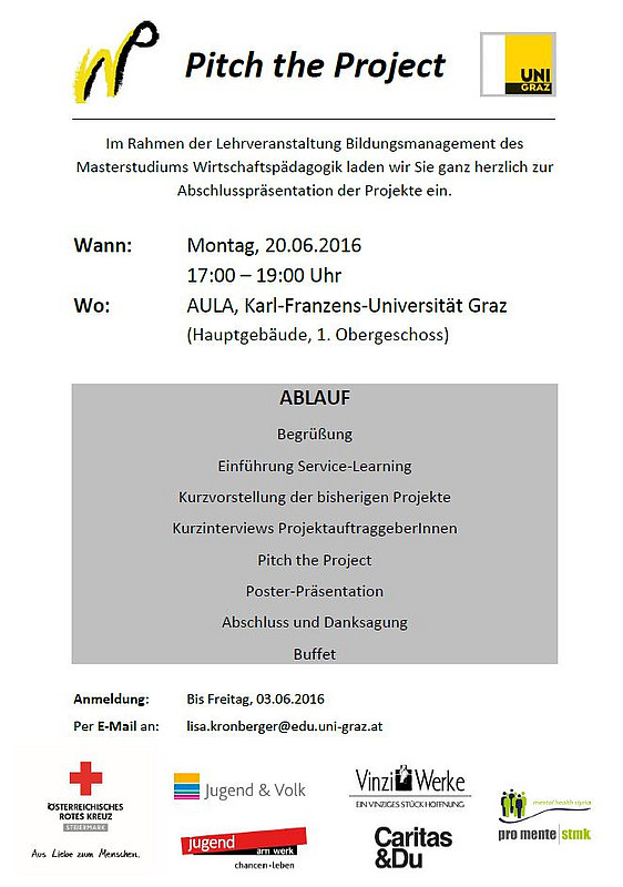 Am 20. Juni 2016 findet ab 17:00 Uhr in der Aula der Karl-Franzens-Universität Graz (Hauptgebäude/1. Obergeschoss) die Abschlussveranstaltung der Lehrveranstaltung Bildungsmanagement statt, welche auch dieses Semester wieder ganz im Zeichen der Lehr-Lern-Form "Service-Learning" steht. Wir möchten alle Interessierten herzlich zu dieser Veranstaltung einladen.