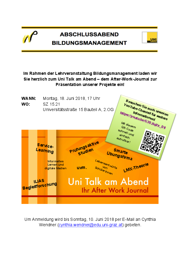 Der Abschlussabend steht unter dem Motto "Uni Talk am Abend - Ihr After Work Journal“, wo wir unsere Projektarbeiten vorstellen und zu einer Diskussion zum Thema „Prüfungsaktive Studien - Maßnahmen zur Erhöhung der Prüfungsaktivität“ und, im Anschluss an den offiziellen Teil, zu einem Buffet laden dürfen.