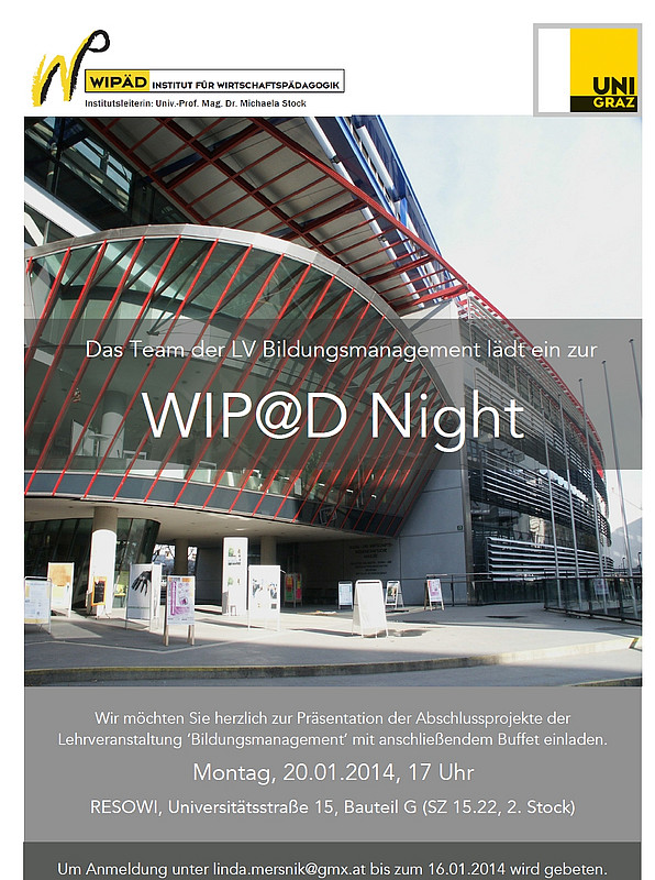 im Namen Ihrer KollegInnen dürfen wir Sie zur Abschlussveranstaltung Bildungsmanagement am 20. Jänner 2014 um 17:00 Uhr einladen.