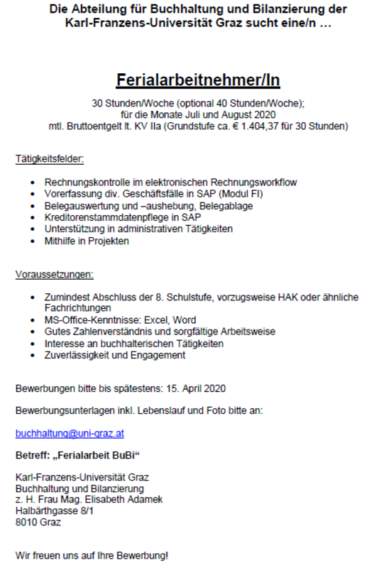 Universität Graz Sozial- und Wirtschaftswissenschaften Institut für Wirtschaftspädagogik Neuigkeiten Ferialjob in der Abteilung Buchhaltung und Bilanzierung