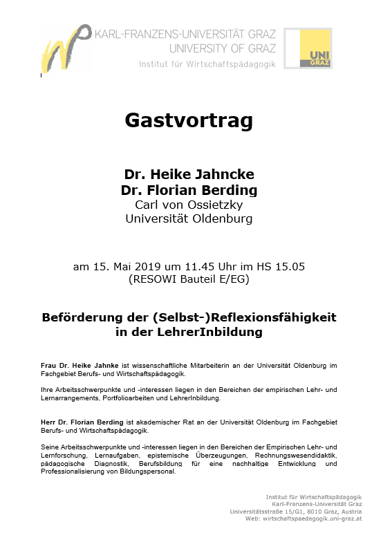 wir möchten Sie recht herzlichen zu unserem nächsten Gastvortrag am 15. Mai 2019 im HS 15.05 (RESOWI, Bauteil E/EG) um 11:45 Uhr zum Thema Beförderung der (Selbst-)Reflexionsfähigkeit in der LehrerInbildung, vorgetragen von Frau Dr. Heike Jahncke und Herrn Dr. Florian Berding (Carl von Ossietzky Universität Oldenburg), einladen.