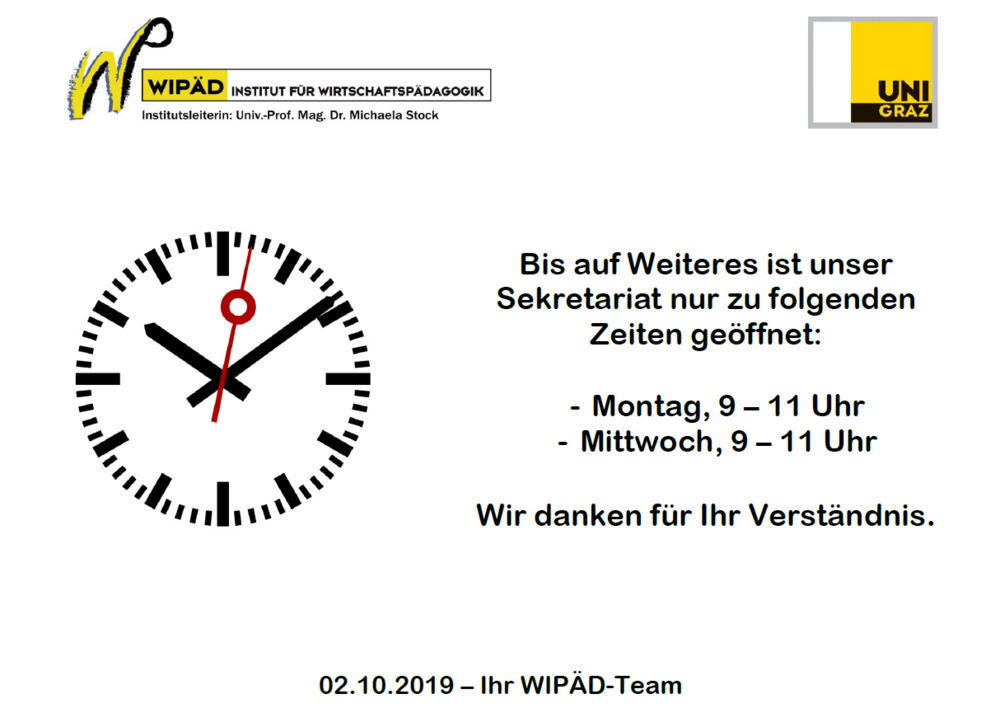 Universität Graz Sozial- und Wirtschaftswissenschaften Institut für Wirtschaftspädagogik Neuigkeiten Geänderte Institutsöffnungszeiten