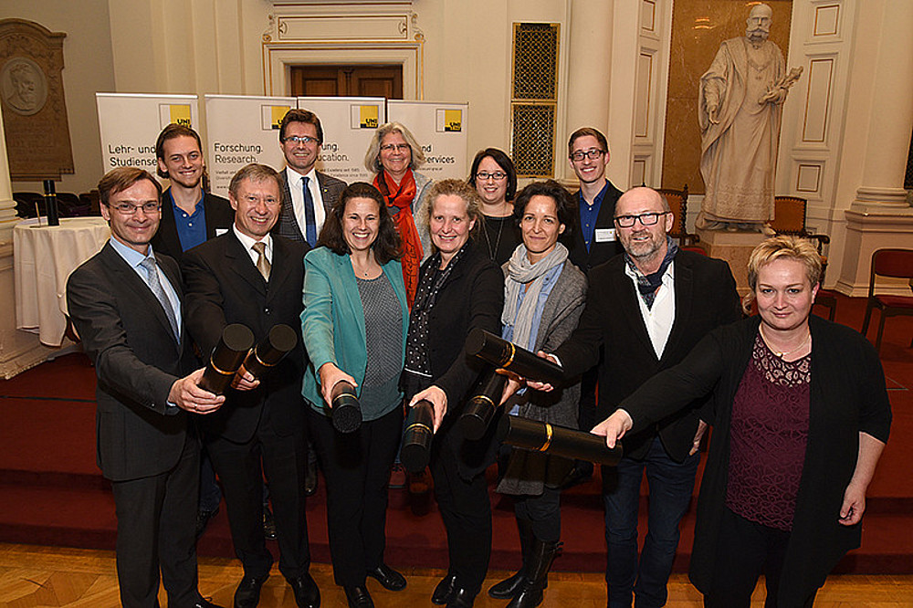 Schluss- und Höhepunkt der Veranstaltung bildete die Verleihung des Lehrpreises „Lehre: Ausgezeichnet!“ für das Studienjahr 2014/15. ÖH-Vorsitzender Markus Trebuch, ÖH-Vertreter Christian Mayer und Vizerektor Polaschek überreichten die Auszeichnungen für besonders erfolgreiche Lehrveranstaltungen mit dem Fokus „Kooperative Lern- und Arbeitsformen“.
