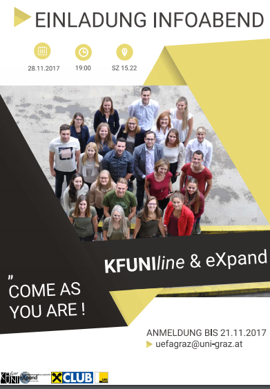 Hier haben Sie die Möglichkeit, die beiden universitären Übungsfirmen, KFUNIline und eXpand, näher kennen zu lernen und wichtige Informationen über den Ablauf des Bewerbungsverfahrens zu erhalten. Wir bitten Sie, sich bis spätestens 21. November 2017 unter der E-Mail-Adresse uefagraz@uni-graz.at anzumelden.