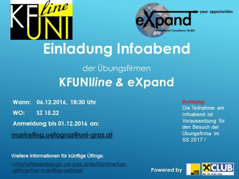 Der Übungsfirmen-Informationsabend findet am 6. Dezember 2016 um 18:30 Uhr statt. Hier haben künftige Üfling die Möglichkeit, die KFUNIline sowie die eXpand kennen zu lernen und wichtige Informationen über die Teilnahme an dem Kurs zu erhalten. Wir freuen uns auf Ihr Kommen!
