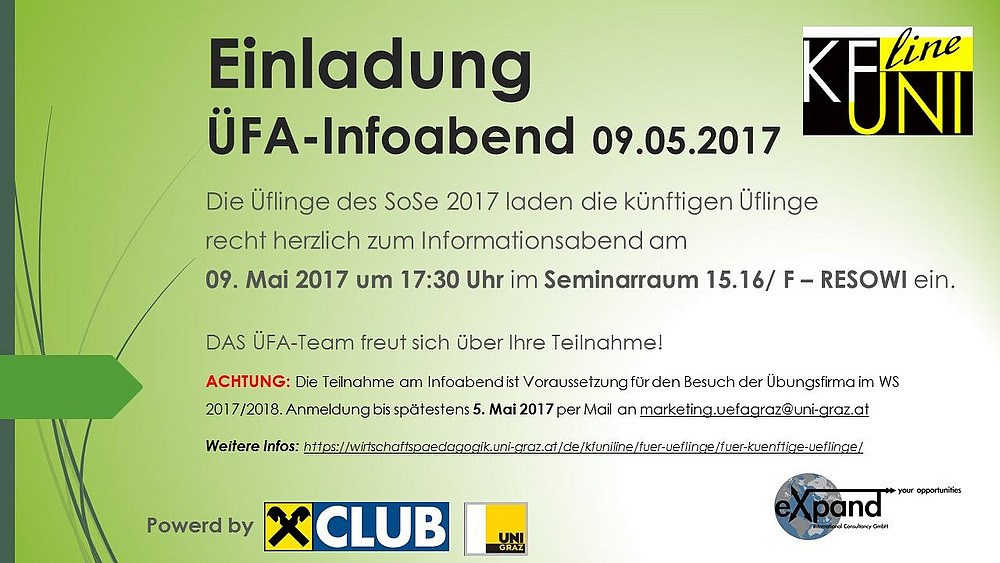 die Üflinge des Sommersemester 2017 freuen sich Sie am Dienstag, den 9. Mai 2017 um 17:30 Uhr zum Übungsfirmen-Informationsabend als zukünftige Üflinge einzuladen. Hier haben Sie die Möglichkeit, die beiden universitären Übungsfirmen KFUNIline und eXpand näher kennen zu lernen und wichtige Informationen über den Ablauf des Bewerbungsverfahrens zu erhalten.