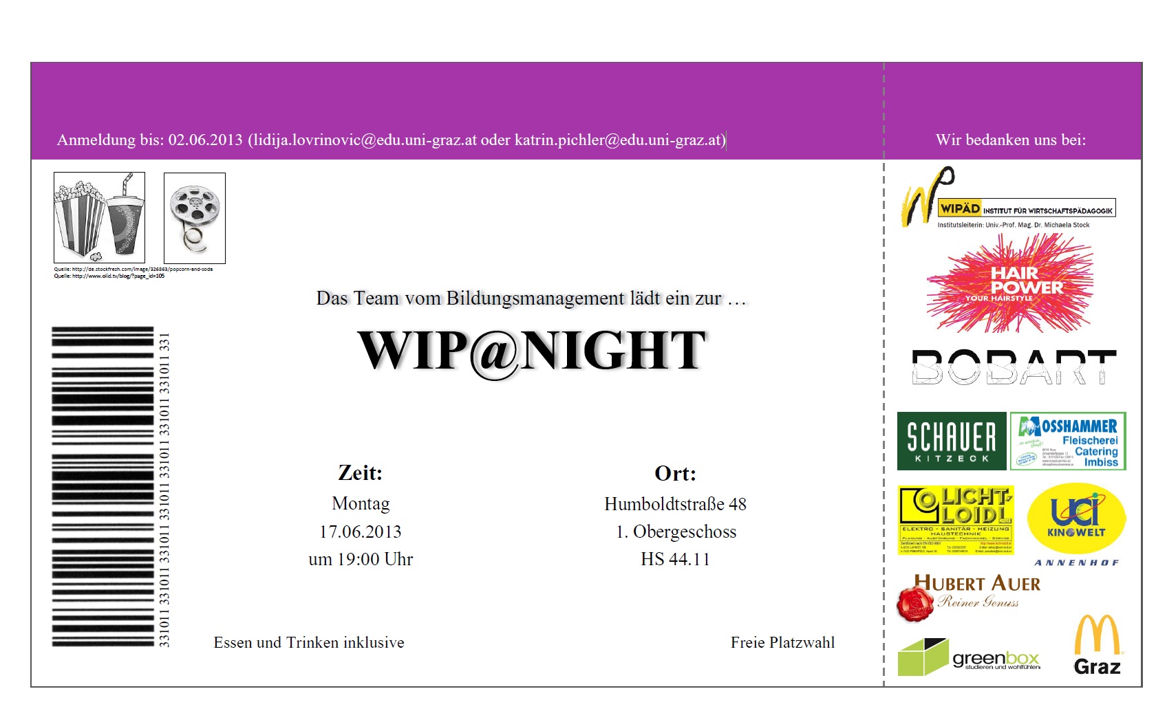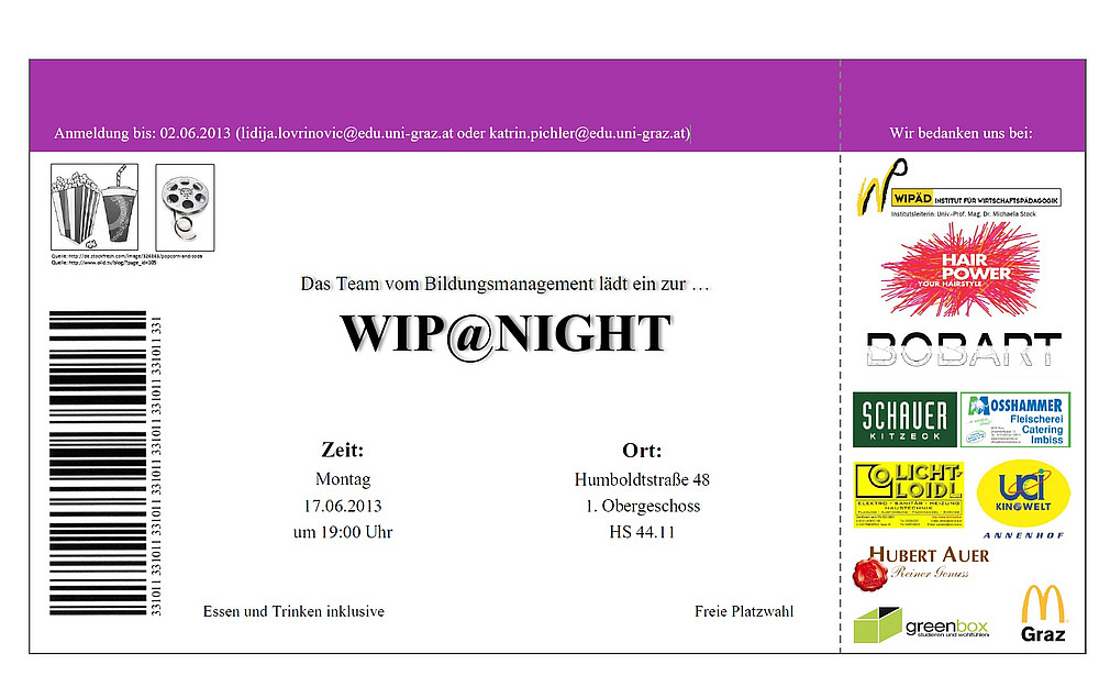 Die Projekte werden in Form eines Films präsentiert. Diesbezüglich laden die Studierenden Sie herzlich zum Wip@Night-Kinoabend ein! Der Eintritt ist frei! Für gute Unterhaltung, Popcorn und Getränke ist gesorgt...